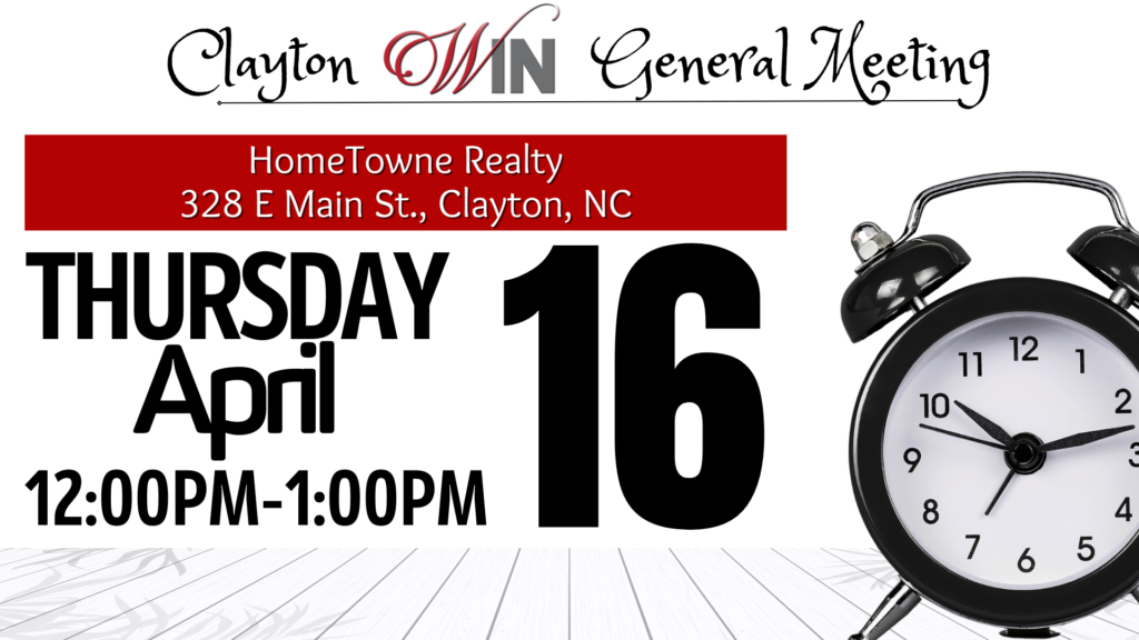 April – General Meeting When April 16, 2026 12:00 pm - 1:00 pm Add To Calendar Download ICS Google Calendar iCalendar Office 365 Outlook Live Where HomeTowne Realty 328 E Main St, Clayton, NC, 27520 Event Type General Meeting Map Unavailable General Meeting – Topic is Preparation for the Women’s Business Expo